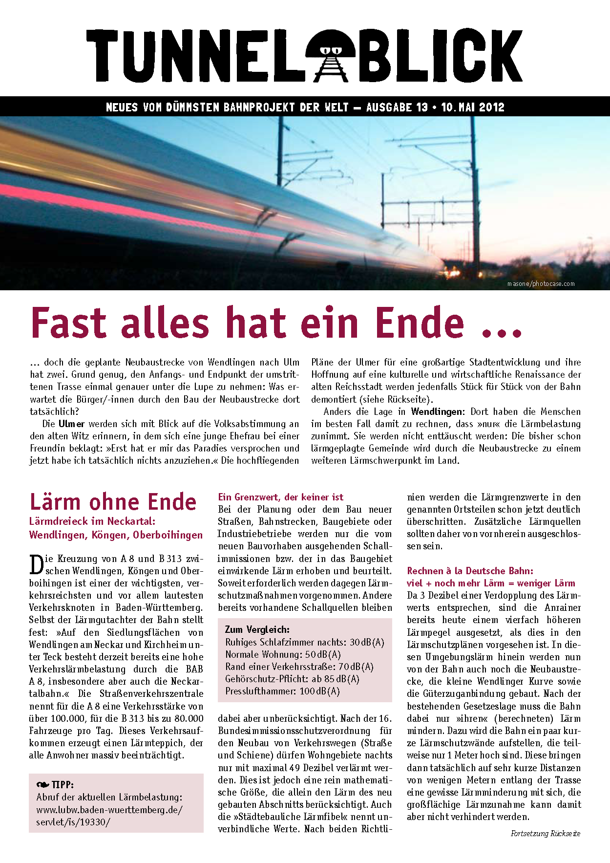 Anders die Lage in Wendlingen: Dort haben die Menschen im besten Fall damit zu rechnen, dass »nur« die Lärmbelastung zunimmt. Sie werden nicht enttäuscht werden: Die bisher schon lärmgeplagte Gemeinde wird durch die Neubaustrecke zu einem weiteren Lärmschwerpunkt im Land.