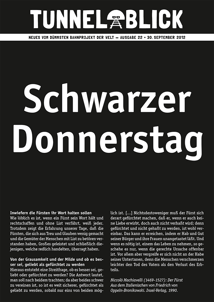 Im selben Maße, in dem wir die Konsequenz aus unserer Erkenntnis ziehen und weitermachen, wachsen unsere Ungeduld und unser Zorn, unser Hunger nach Wiedergutmachung und nach Gerechtigkeit: auf den Montagsdemonstrationen, bei Blockaden, bei Aktionen, im Ringen um die besseren Argumente, im Kampf um unser Mineralwasser, um unsere Bäume, um unsere Häuser, um unsere Stadt, um unser Land, um unsere Grundrechte und unsere Zukunft – und um einen Bahnhof, mit dem alles begann.