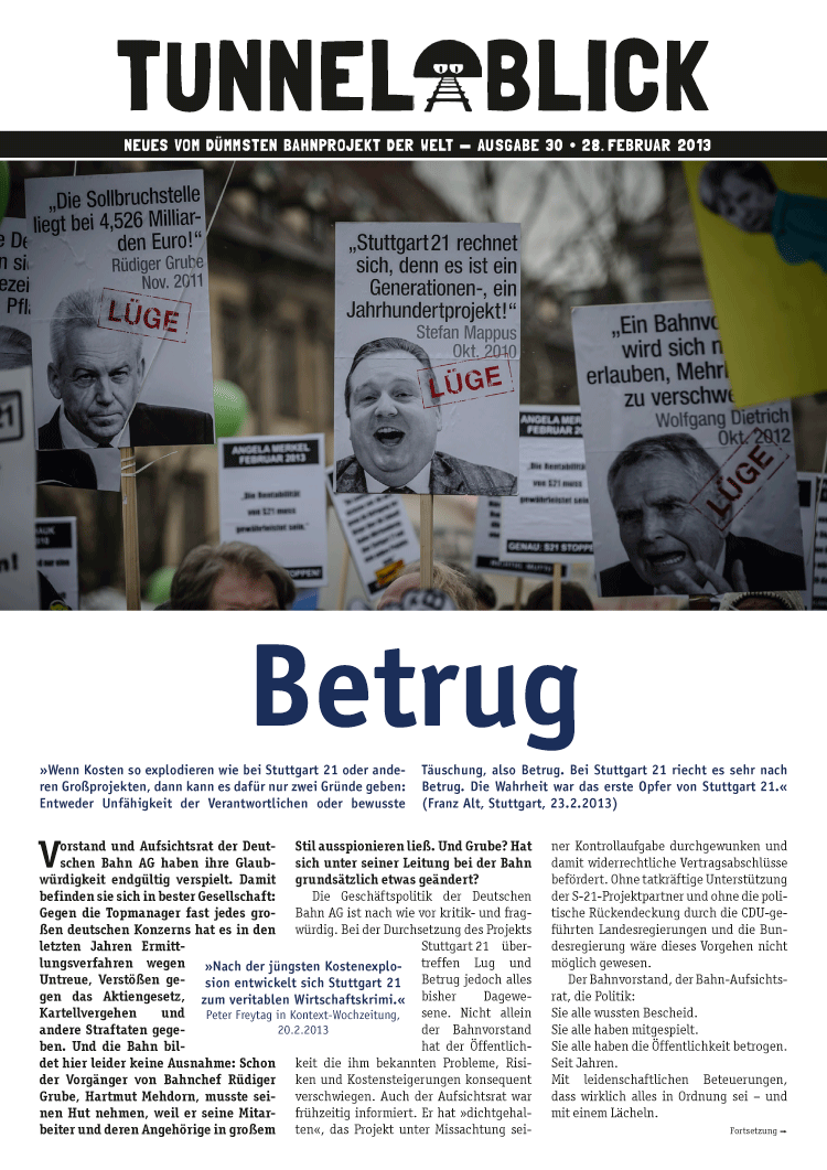»Wenn Kosten so explodieren wie bei Stuttgart 21 oder anderen Großprojekten, dann kann es dafür nur zwei Gründe geben: Entweder Unfähigkeit der Verantwortlichen oder bewusste Täuschung, also Betrug. Bei Stuttgart 21 riecht es sehr nach Betrug. Die Wahrheit war das erste Opfer von Stuttgart 21.« (Franz Alt, Stuttgart, 23.2.2013)