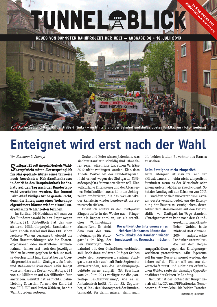 Stuttgart 21 soll Angela Merkels Wahlkampf nicht stören. Der ursprünglich für Mai geplante Abriss eines teilweise noch bewohnten Mehrfamilienhauses in der Nähe des Stuttgarter Hauptbahnhofs ist deshalb auf den Tag nach der Bundestagswahl verschoben worden. Das kommt Bahn-Chef Rüdiger Grube gerade Recht, denn die Enteignung eines Wohnungseigentümers könnte wieder einmal unerwünschte Schlagzeilen bringen.