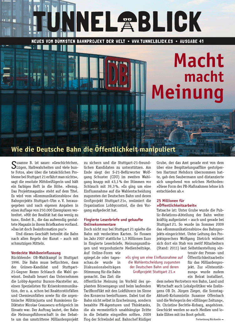 25 Millionen Euro – so viel sollen für die »Öffentlichkeitsarbeit« von Stuttgart 21 von 2009 bis 2020 mindestens ausgegeben werden. Offiziell. Die PR-Leute der Bahn können also aus dem vollen Schöpfen. Ihr Geschäft ist die Desinformation und die betreiben sie nach allen Regeln der Kunst – auch mit schmutzigen Mitteln.