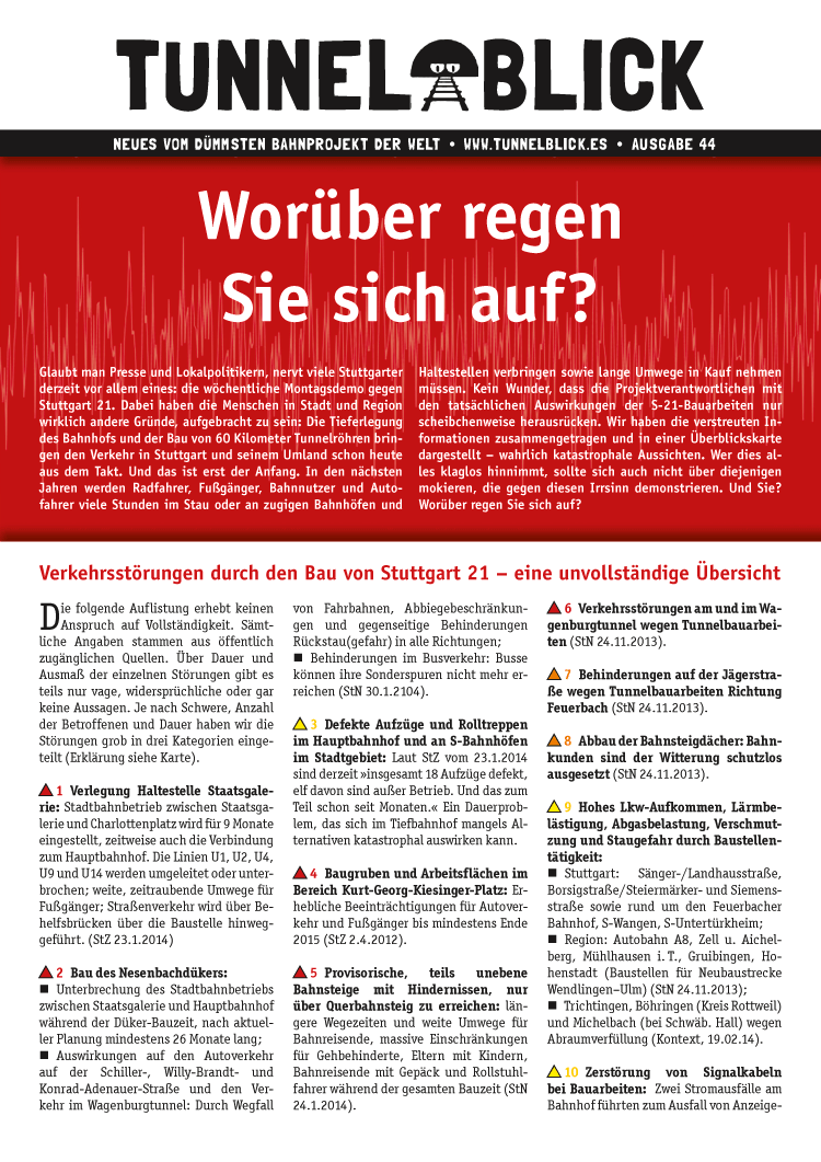 Glaubt man Presse und Lokalpolitikern, nervt viele Stuttgarter derzeit vor allem eines: die wöchentliche Montagsdemo gegen Stuttgart 21. Dabei haben die Menschen in Stadt und Region wirklich andere Gründe, aufgebracht zu sein: Die Tieferlegung des Bahnhofs und der Bau von 60 Kilometer Tunnelröhren bringen den Verkehr in Stuttgart und seinem Umland schon heute aus dem Takt. Und das ist erst der Anfang. In den nächsten Jahren werden Radfahrer, Fußgänger, Bahnnutzer und Autofahrer viele Stunden im Stau oder an zugigen Bahnhöfen und Haltestellen verbringen sowie lange Umwege in Kauf nehmen müssen. Kein Wunder, dass die Projektverantwortlichen mit den tatsächlichen Auswirkungen der S-21-Bauarbeiten nur scheibchenweise herausrücken. Wir haben die verstreuten Informationen zusammengetragen und in einer Überblickskarte dargestellt – wahrlich katastrophale Aussichten. Wer dies alles klaglos hinnimmt, sollte sich auch nicht über diejenigen mokieren, die gegen diesen Irrsinn demonstrieren. Und Sie? Worüber regen Sie sich auf?