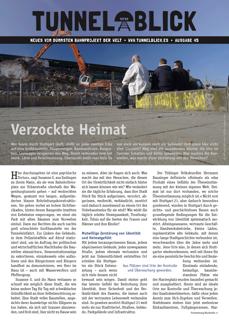Wer heute durch Stuttgart läuft, stößt an jeder zweiten Ecke auf eine Großbaustelle. Absperrungen, Baumaschinen, Baugruben, Lastwagen versperren den Weg. Damit verbunden sind Gestank, Lärm und Verschmutzung. Überrascht stellt man fest: Da war doch vor kurzem noch ein Gebäude! Und stand hier nicht eine Sitzbank? Weg sind die ausladenden Bäume, die hier im Sommer Schatten und Kühle spendeten. Was machen die Baustellen, was macht diese Zerstörung mit den Menschen?