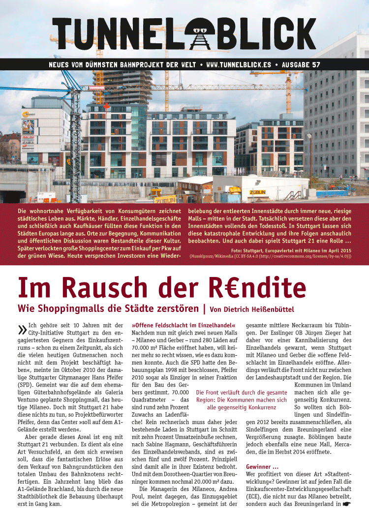 Die wohnortnahe Verfügbarkeit von Konsumgütern zeichnet städtisches Leben aus. Märkte, Händler, Einzelhandelsgeschäfte und schließlich auch Kaufhäuser füllten diese Funktion in den Städten Europas lange aus. Orte zur Begegnung, Kommunikation und öffentlichen Diskussion waren Bestandteile dieser Kultur. Später verlockten große Shoppingcenter zum Einkauf per Pkw auf der grünen Wiese. Heute versprechen Investoren eine Wiederbelebung der entleerten Innenstädte durch immer neue, riesige Malls – mitten in der Stadt. Tatsächlich versetzen diese aber den Innenstädten vollends den Todesstoß. In Stuttgart lassen sich diese katastrophale Entwicklung und ihre Folgen anschaulich beobachten. Und auch dabei spielt Stuttgart 21 eine Rolle …