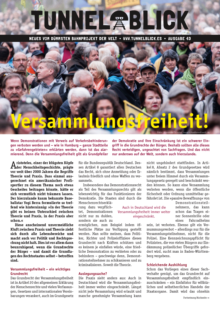 Wenn Demonstrationen mit Verweis auf Verkehrsbehinderungen verboten werden und – wie in Hamburg – ganze Stadtteile zu »Gefahrengebieten« erklärten werden, dann ist das alarmierend. Denn die Versammlungsfreiheit gilt als Grundpfeiler der Demokratie und ihre Einschränkung ist ein schwerer Eingriff in die Grundrechte der Bürger. Deshalb sollten alle dieses Recht verteidigen, ungeachtet von Sachfragen. Und das nicht nur anderswo auf der Welt, sondern auch hierzulande.