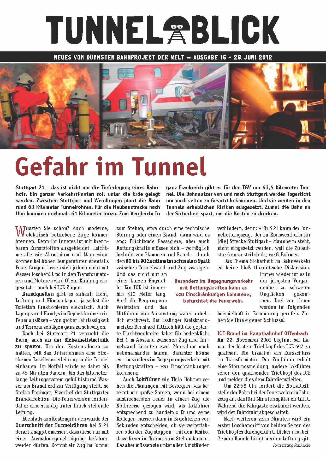 Stuttgart 21 – das ist nicht nur die Tieferlegung eines Bahnhofs. Ein ganzer Verkehrsknoten soll unter die Erde gelegt werden. Zwischen Stuttgart und Wendlingen plant die Bahn rund 63 Kilometer Tunnelröhren. Für die Neubaustrecke nach Ulm kommen nochmals 61 Kilometer hinzu. Zum Vergleich: In ganz Frankreich gibt es für den TGV nur 43,5 Kilometer Tunnel. Die Bahnnutzer von und nach Stuttgart werden Tageslicht nur noch selten zu Gesicht bekommen. Und sie werden in den Tunneln erheblichen Risiken ausgesetzt. Zumal die Bahn an der Sicherheit spart, um die Kosten zu drücken.